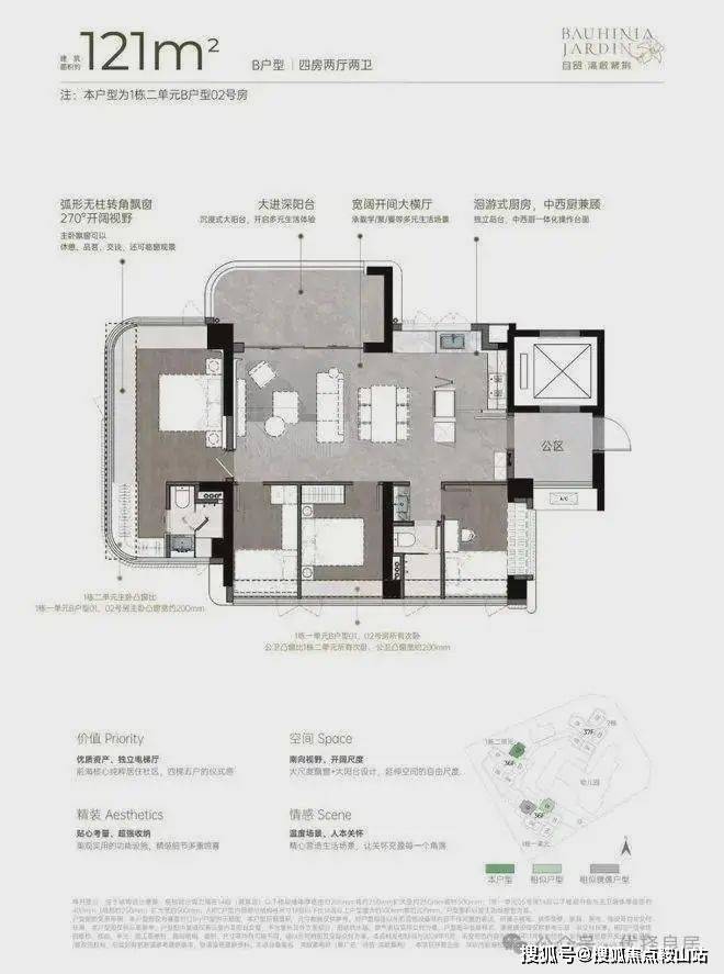 121㎡的4房2厅2卫,设计的是横厅南北通透格局,专梯入户有独立公区,客餐厅7.15米开间,LDKB一体化设计,动静分区,主卧大套间无柱弧形270°转角飘窗,客厅大进深阳台,洄游式中西厨房,公卫三段式分离,得房率约92-100%(包含赠送),阳台主朝西南或东南向。