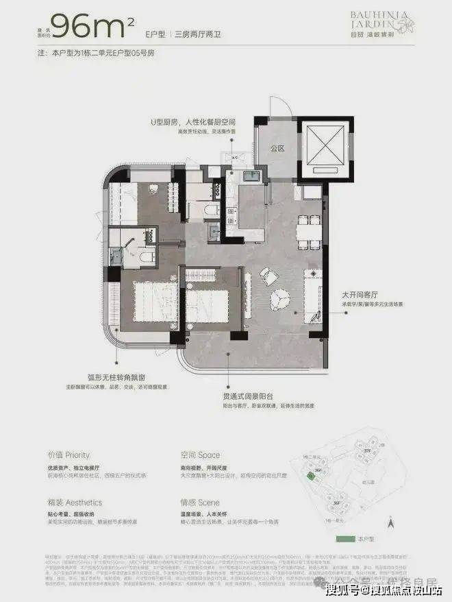 96㎡的3房2厅2卫,仅1栋2单元E户型,设计的是竖厅格局,客厅3.9米开间,LDKB一体化设计,动静分区,三开间朝南,主卧无柱弧形转角飘窗,客厅连接次卧出大阳台,U型厨房,公卫三段式分离,得房率约92-100%(包含赠送),西南朝向。