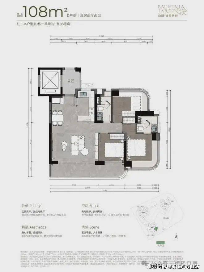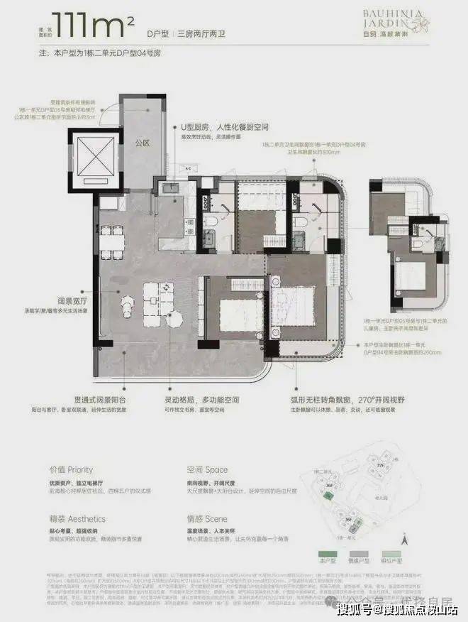 108-111㎡的3房2厅2卫,设计的是竖厅格局,客厅5.15米开间,超宽客厅,LDKB一体化设计,动静分区,三开间朝南,主卧大套间无柱弧形270°转角飘窗,客厅连接次卧出大阳台,U型厨房,卫生间干湿分离,得房率约92-100%(包含赠送),西南或东南朝向。