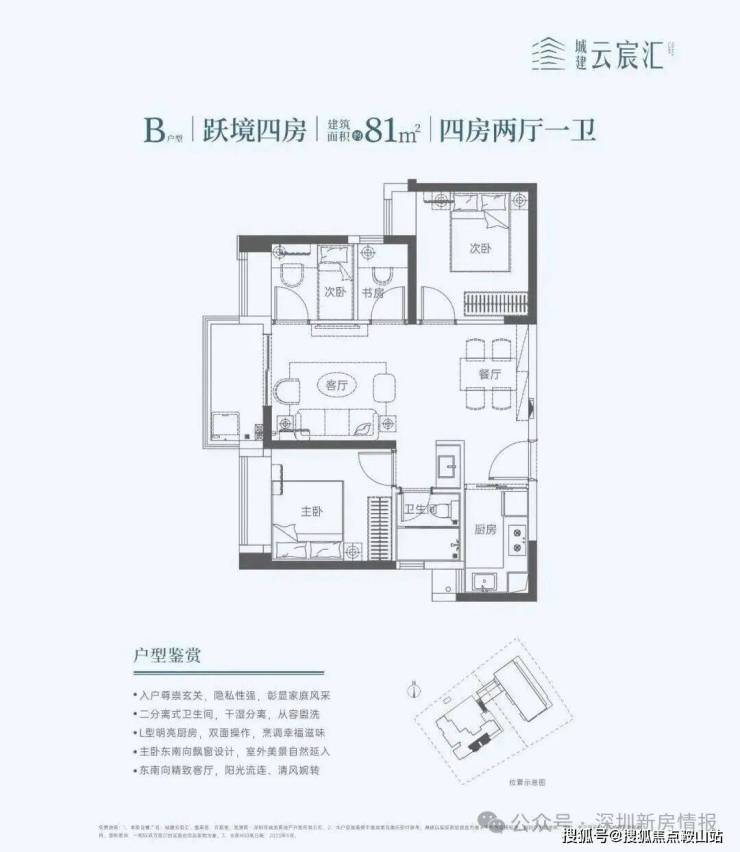 81㎡的4房2厅1卫,设计的双龙抱珠格局,餐客厅一体化,L型厨房,东南朝向,这个面积段能做到4房现在的市面上非常难得。
