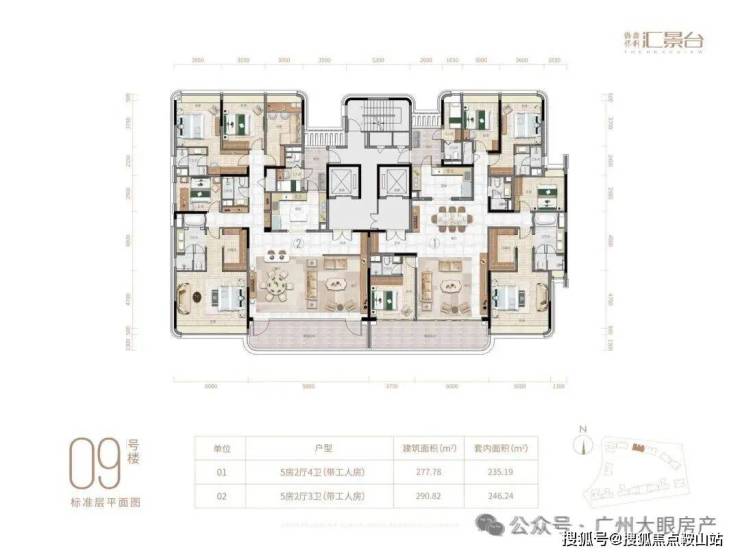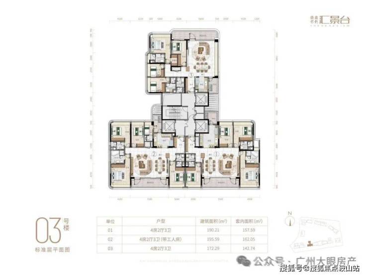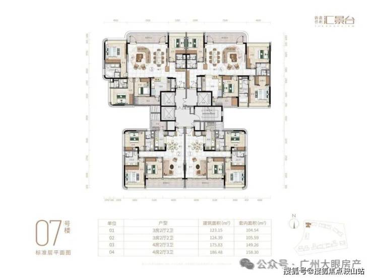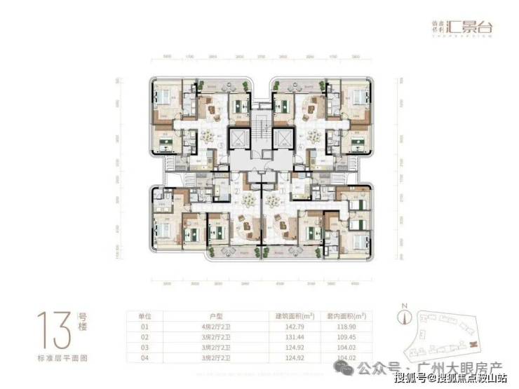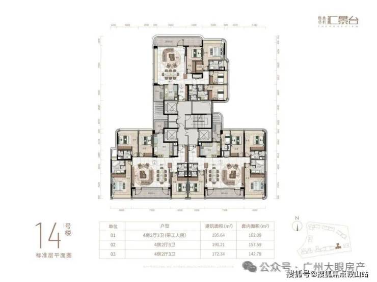项目由14栋12层小高层组成,产品涵盖123-352㎡三至五房,共8类户型,户型实用率约82-84%