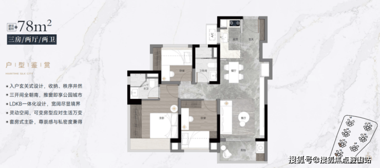 【78-79㎡三房二卫户型鉴赏】:板块最低总价南向三房二卫
