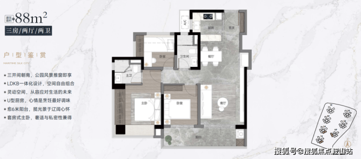 【88-90㎡三房二卫户型鉴赏】:约10㎡连体阳台,300-350万必看,相同总价比竞品多10个方