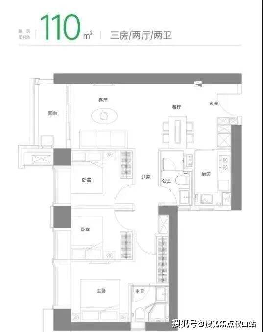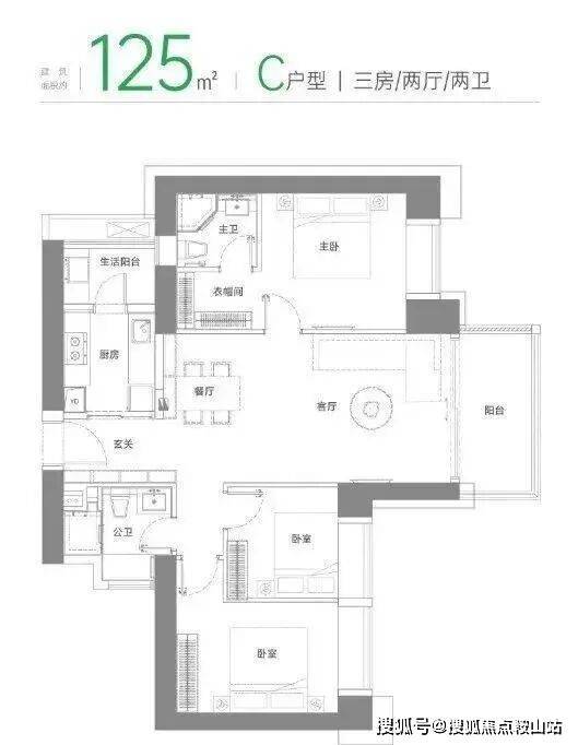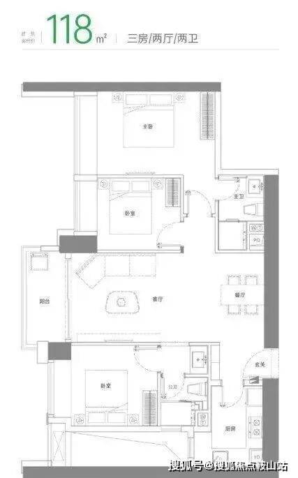 缺点是,两侧单面采光设计,没有侧向采光面,主卧为暗卫,厨房和公卫采光差。