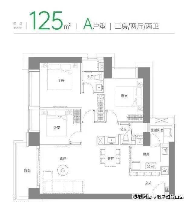 A户型:传统的三房两厅两卫,动静分区户型,厨房带生活阳台。房间做得相对均衡。也是货量最多的户型