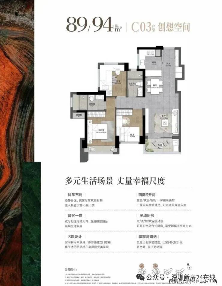 89-94平:3房2厅2卫,套内净使用率在80%,东南朝向