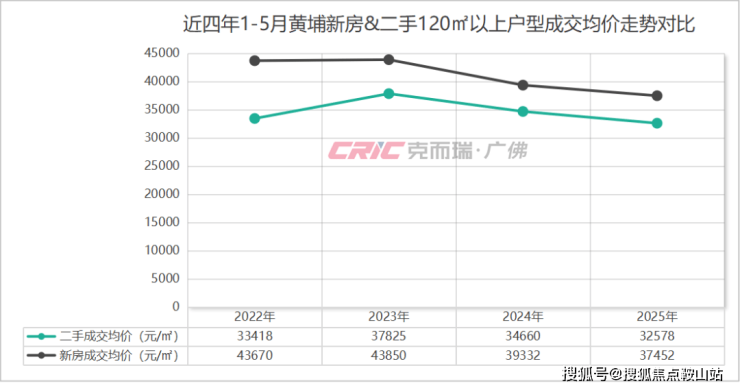 在价格上,克而瑞数据监测显示,今年1-5月黄埔区120㎡以上二手房成交均价32578元/㎡,较去年同时期下跌6%。
