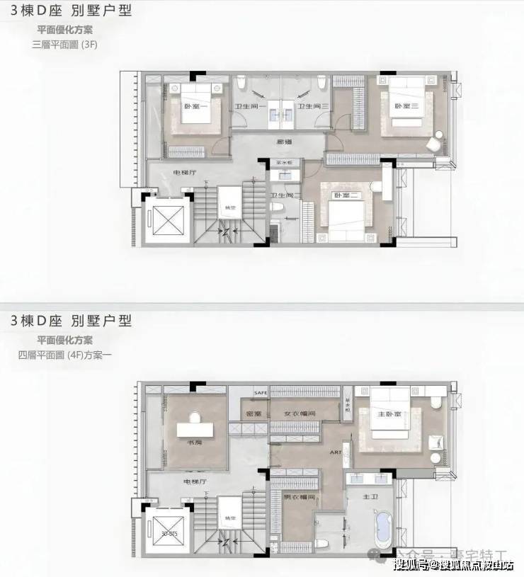 【约280㎡4+1房4卫】双梯入户,独立电梯厅,阔绰横厅直连阳台,三面舒适采光,主次卧双套房,270°环幕视野,还有独立家政套间,西南朝向看城市景观,高层可看深圳湾海景;
