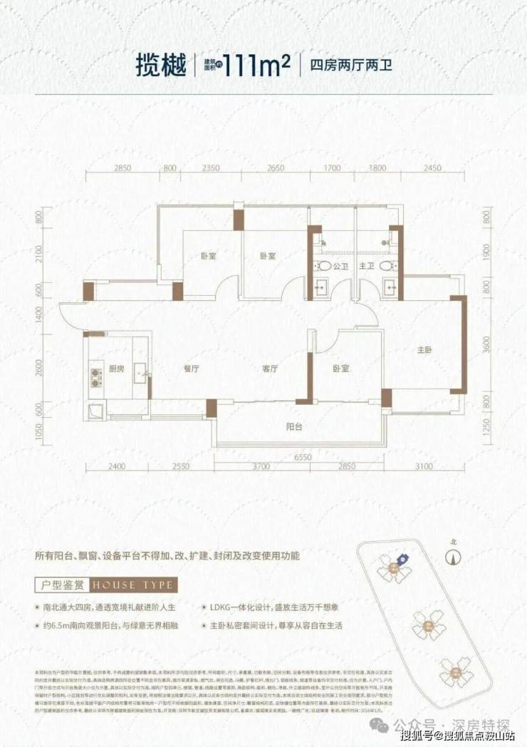 111㎡的4房2厅2卫,设计的是横厅南北通透格局,独门独户,进门入户玄关,客餐厅6.2米开间,LDKB一体化,全屋10面飘窗,主卧南北通,客厅连接次卧出6.8米长的大阳台,U型厨房,卫生间干湿分离,得房率约95.73%(包含赠送),阳台主朝东南向。⛅☀︎玖珑臻境售楼处电话:400-119-1130☎☎☀︎