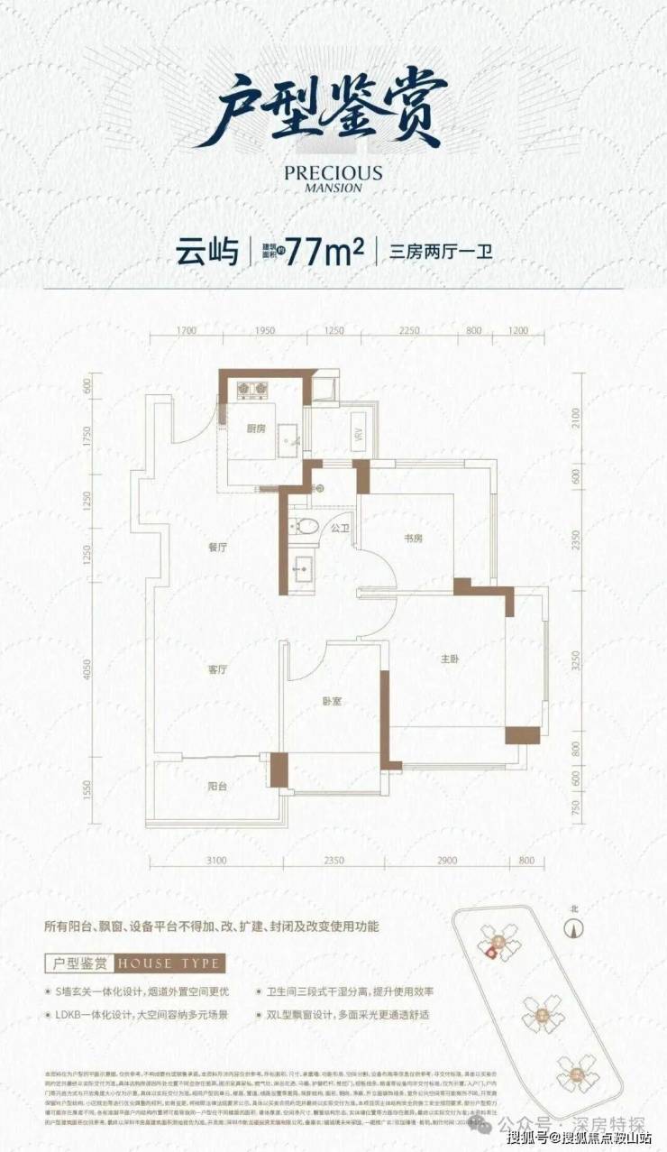 77㎡-3房2厅1卫,设计的是经典竖厅格局,客厅3.3开间,LDKB一体化,S墙设计预留冰箱卡槽位,动静分区,三开间朝南,U型厨房,卫生间三段式分离,还带1个设备平台,得房率约88.34%(包含赠送),西南朝向。
