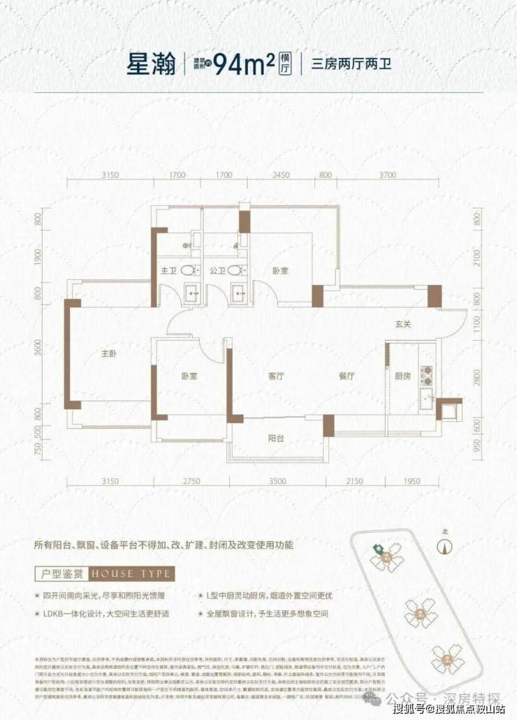 94㎡的3房2厅2卫(-2),设计的是横厅南北通透格局,独门独户,进门入户玄关,客餐厅5.7米开间,LDKB一体化,全屋10面飘窗,主卧南北通,U型厨房,卫生间干湿分离,得房率约93.73%(包含赠送),阳台主朝西南向。