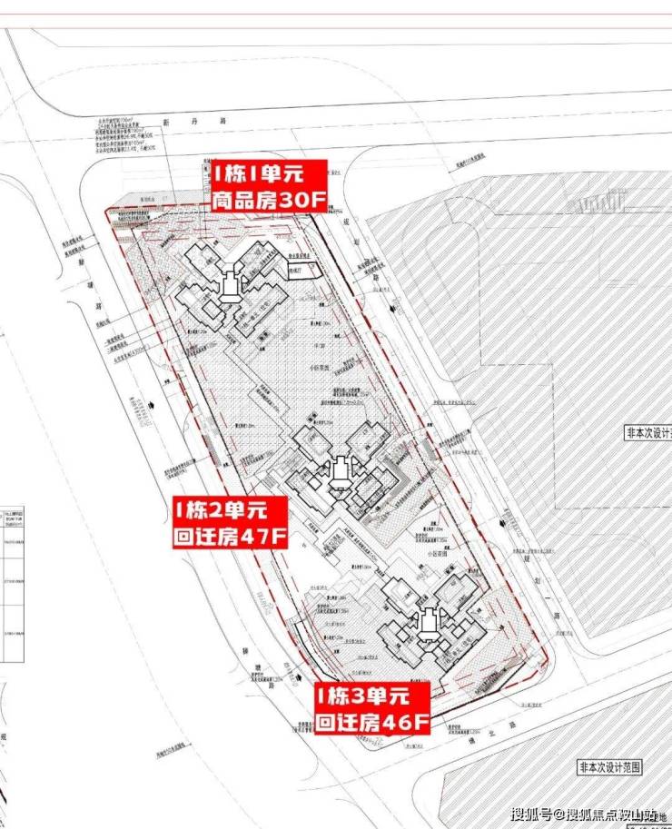 福城境未来家园(1期),总占地面积约1.41万㎡,总建筑面积约10.65万㎡,其中计容建筑面积约7.27万㎡,容积率5.2,共由3栋住宅组成,其中1栋1单元商品房30F,2梯6户设计,1栋2单元回迁房47F,1栋3单元回迁房46F,均是3梯6户设计。