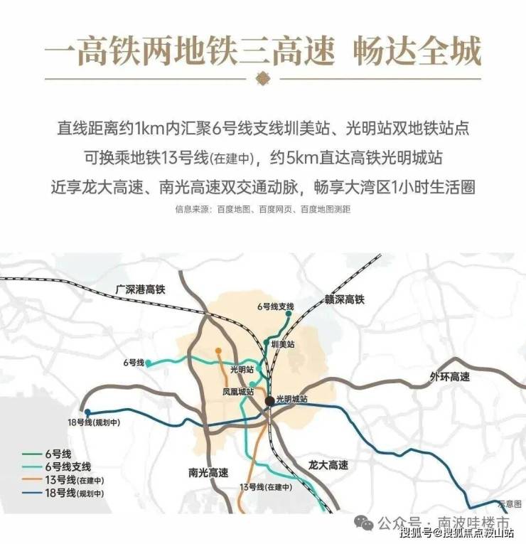 直线距离约1km内汇聚6号线支线圳美站、光明站双地铁站点可换乘地铁13号线(在建中),约5km直达高铁光明城站