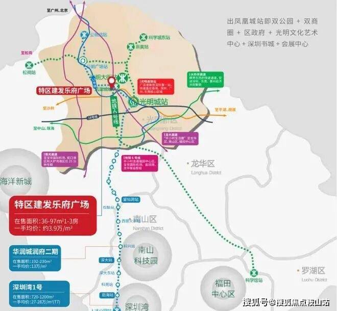 特区建发乐府广场位于光明区光明大道和观光路的交汇处西侧、(地铁6号、13号线凤凰城站口),龙大高速光明出口处,紧邻区政府,雄踞光明科学城门户的重要位置,占据光明区政治、经济、文化中心,紧邻占地约10万㎡开明公园、占地约57万㎡区级市政公园新城公园,周边各项配套日益完善。