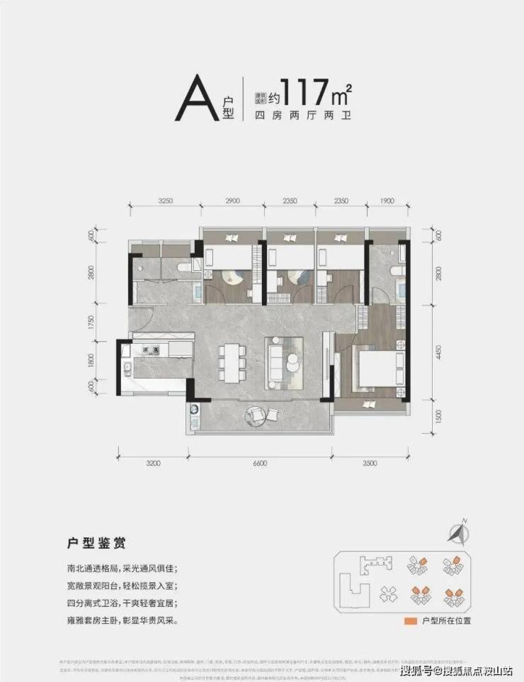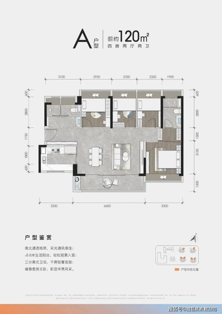 120㎡的南北通透横厅四房两厅两卫,带6.6米宽境大阳台,各功能区面积更阔绰,很适合改善型家庭三世同堂。
