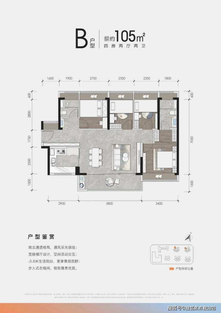一共有62套:105㎡的南北通透横厅四房两厅两卫,带5.8米超大景观生活两用阳台,全屋采光、透气效果绝佳,主卧还配置了步入式的衣帽间,对于二孩家庭来说,是非常高性价比的一步到位选择。