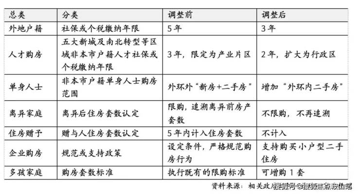 此次通知在住房限购政策上进行松绑:包括非本市户籍购房社保年限由5年调整为3年;非本市户籍单身人士可购买外环内二手房;人才购房由3年改为2年,范围由产业片区扩大为行政区;取消离婚三年合并计算限购套数的政策;取消赠与5年内计入赠与人住房套数的政策;支持企业购买小户型二手房;多子女家庭可额外增加一套购买名额。