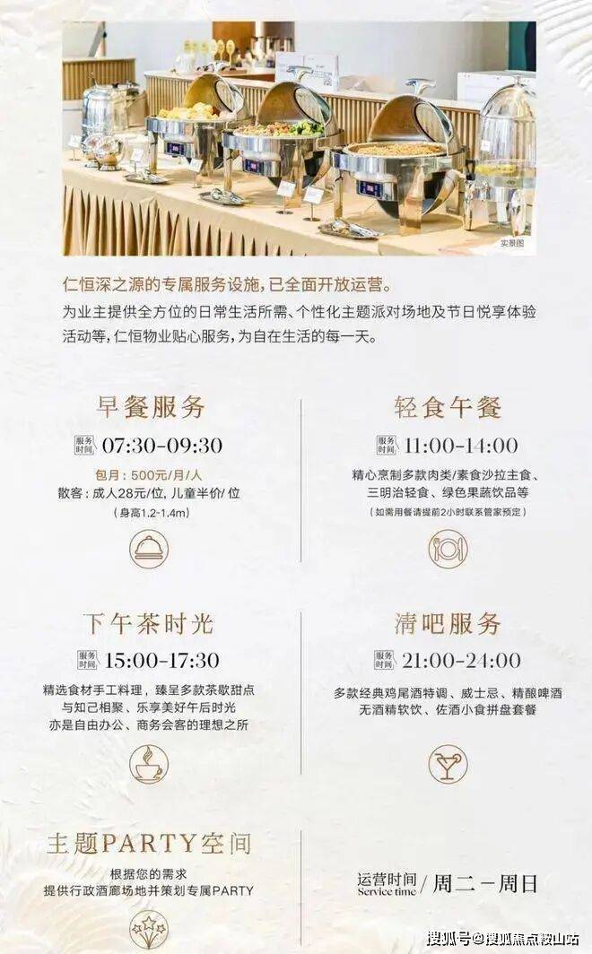 ◎优雅逸境行政酒廊,以“开放式设计+订制化服务”的运营理念,构建“圈层社交+个人私享”的全新体验, 提供自助早餐(500元/月)、轻食午餐预定服务,供业主及来宾悠享,全天候多为社交场景+户外露台,可预约包场定制主题派对等专属生活场