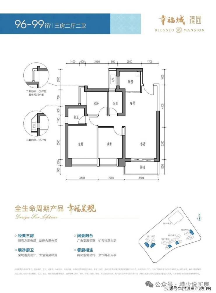 96-99㎡的3房2厅2卫,设计的是经典竖厅格局,客厅3.5米开间,LDKB一体化设计,动静分区,3个卧室分别做到了主卧14.63㎡/次卧11.07㎡/次卧7.26㎡(包含墙体飘窗),U型厨房,卫生间干湿分离,得房率约81-84%(包含赠送),东南/西南或东北朝向。