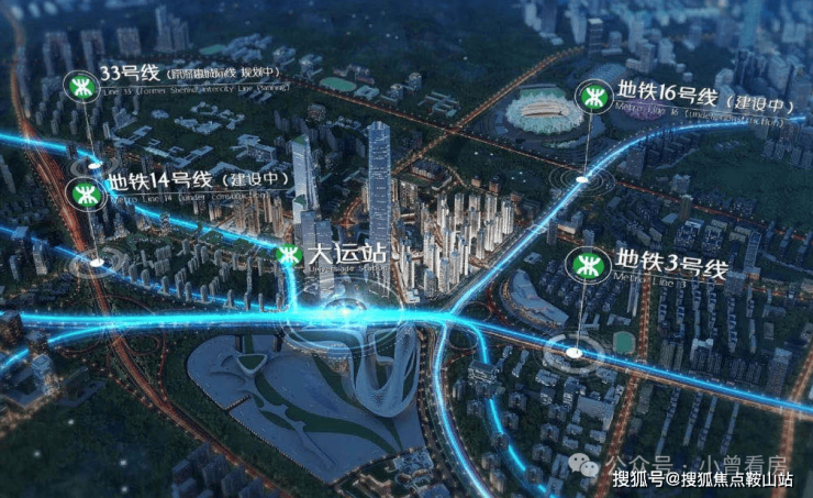 湾区之舞大运枢纽站标杆大盘,四轨交汇,地铁3号线和14号线、16号线和33号线(建设中),大运站将成为深圳东部大型交通枢纽,毗邻水官高速、机荷高速、惠盐高速等高速路网,多维交通网络,以速度激活全域,高效畅达湾区。
