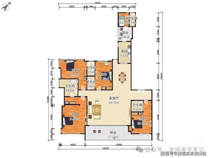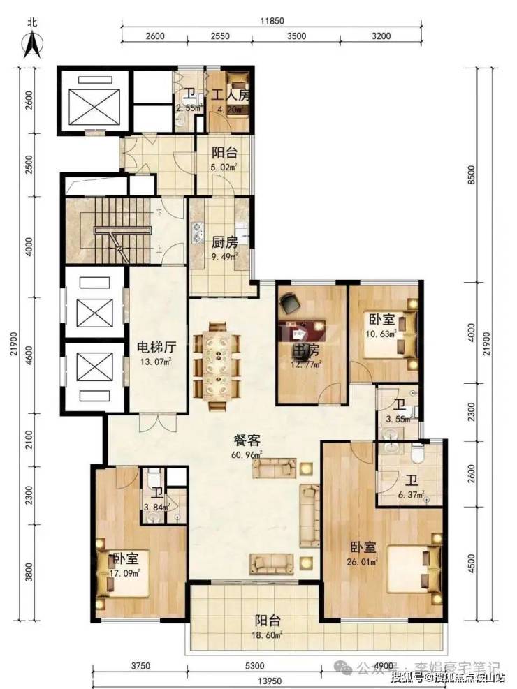 170㎡四房:套内面积达220㎡(赠送50㎡),三卧+客厅朝南,3梯2户专梯入户,保姆套房独立设计。