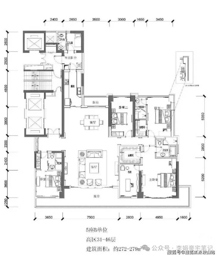 5栋43B(272㎡楼王):使用面积350㎡,4+2房,L型大阳台,300°环幕海景,三梯两户专梯入户,总价约7500-8500万。