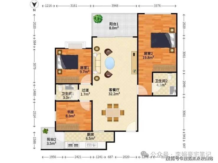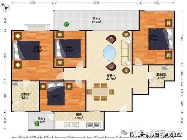4栋 83㎡三房:双卧朝南,双阳台,赠送套内面积达100㎡,可改3+1房 ,西南朝向