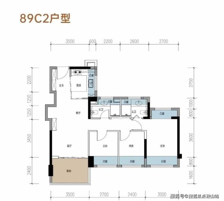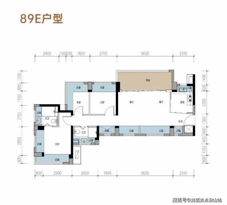 约89㎡横厅3房西南户型总价297-317万元,东南侧户型均价约为302-330万元;