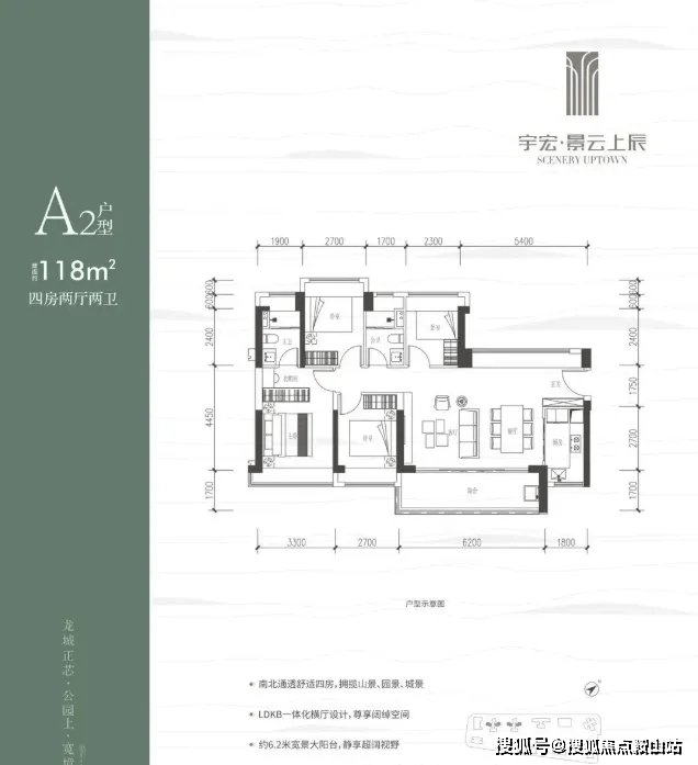118㎡的4房2厅2卫:横厅南北通透格局,客餐厅6.2米开间,LDKB一体化,五开间朝南,西北面5.4米长的观景大飘窗,得房率约76%(不含赠送),东南朝向。