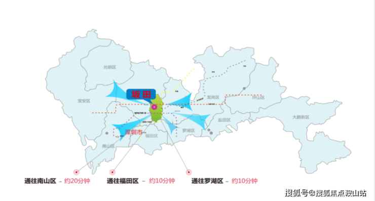 坂田位处深圳地理中心,10分钟内到深圳福田区、罗湖区,20分钟到南山区,一小时到香港、惠州、东莞,两小时覆盖广州、中山、珠海