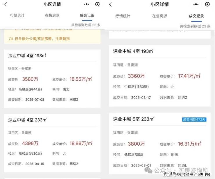 但天健天骄北庐就有点“拖后腿”,2019年8月29日,天健天骄南苑开盘,推出515套90-171㎡住宅,开盘当天售出414套,去化率80%。2020年11月28日,天健天骄北庐开盘,推出207套122-266㎡住宅,备案价11.76万,约4小时售罄。2022年6月,天健天骄西筑开盘,去化约9成。当时开盘价格约为11.4万元/平方米。2025年8月二手房最低价去到了11.52万/㎡,最高价13.66万,主要是同片区新盘竞争太激烈。加上片区随然说靠近香蜜湖但毕竟是属于景田片区,再就是学区没有香蜜湖优质,带的是荔园外国语小学(天骄校区)➕红岭教育集团科技中学。相比上面深业中城不管是地段还是学区都是有所差距的