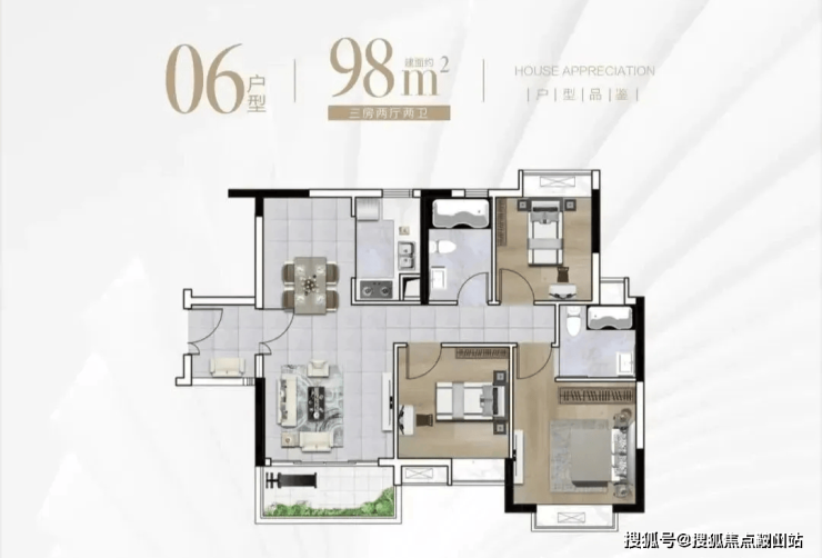 面约98㎡户型则更适合于三代同堂的家庭,主卧带有独立卫生间,更能保障男女主人的隐私,享受二人世界。
