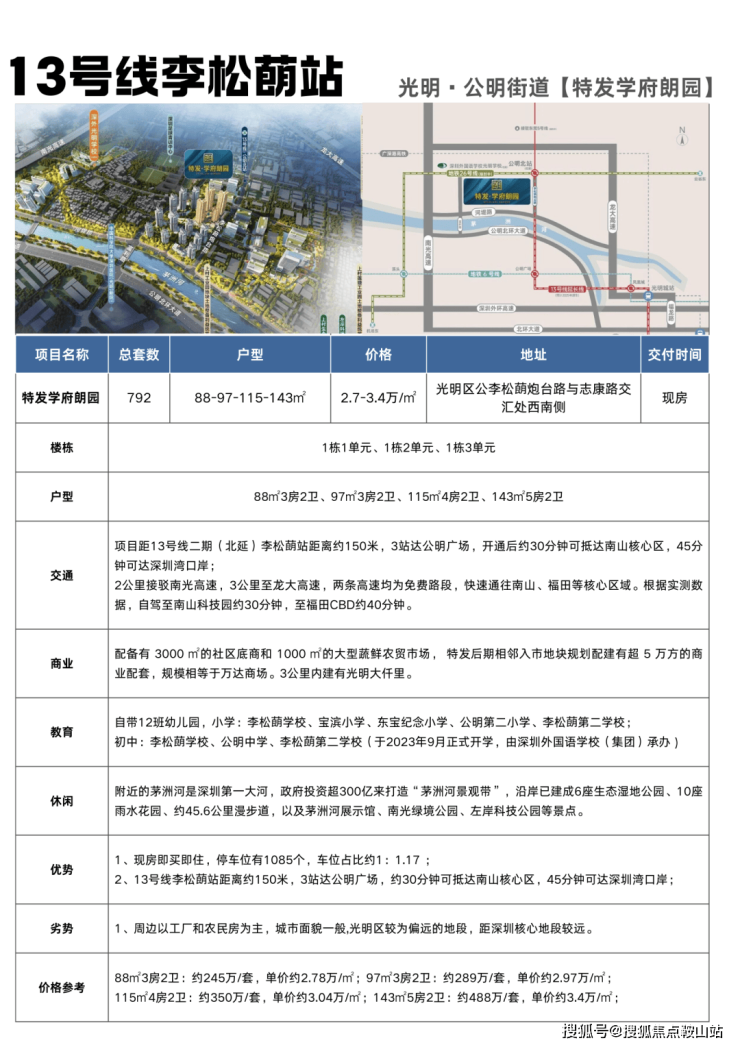 2、13号线李松蓢站距离约150米,3站达公明广场,约30分钟可抵达南山核心区,45分钟可达深圳湾口岸;