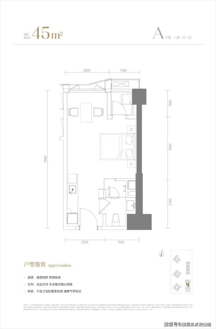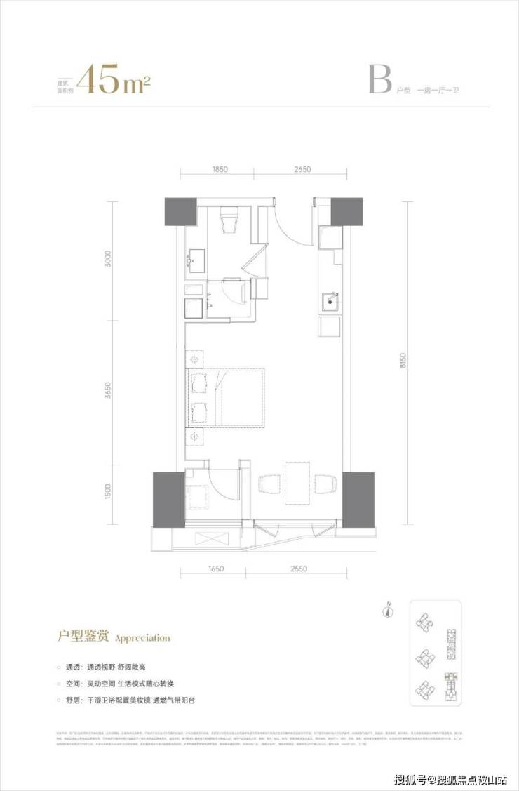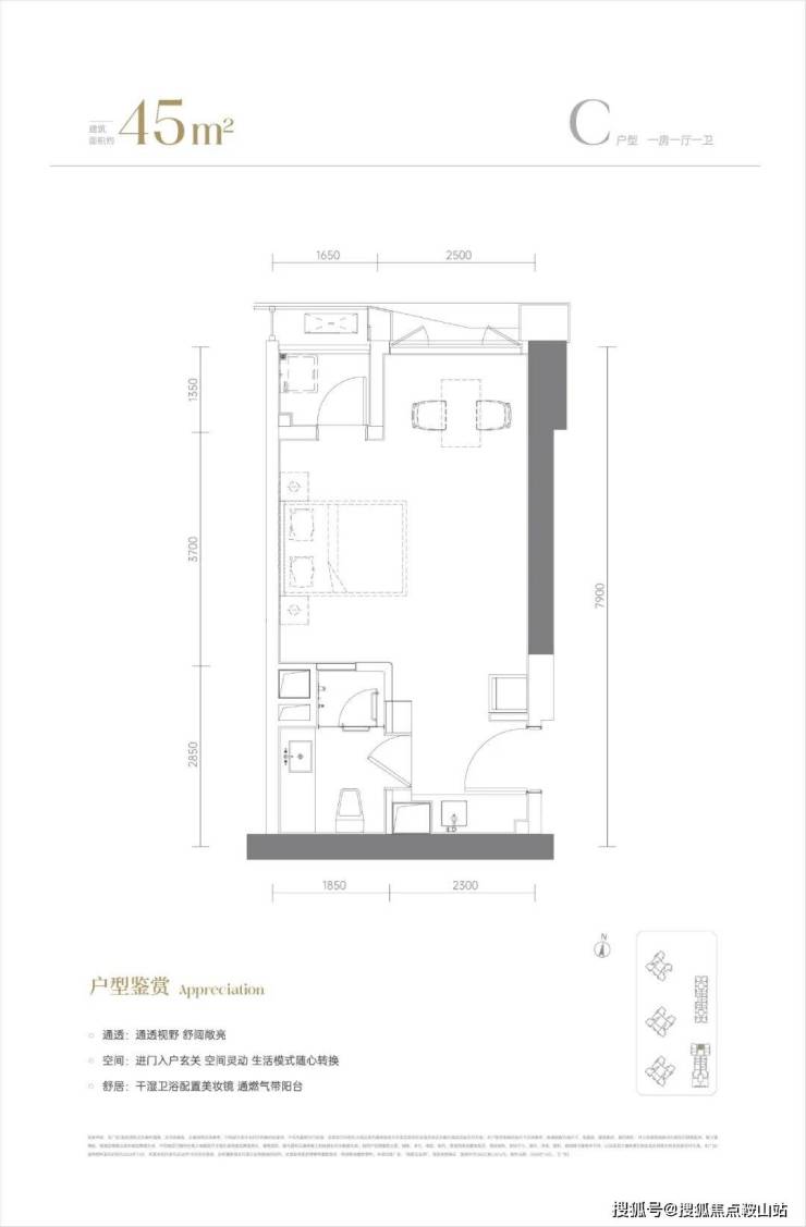 45㎡一房一厅(约453套)户型方正,客厅带阳台。