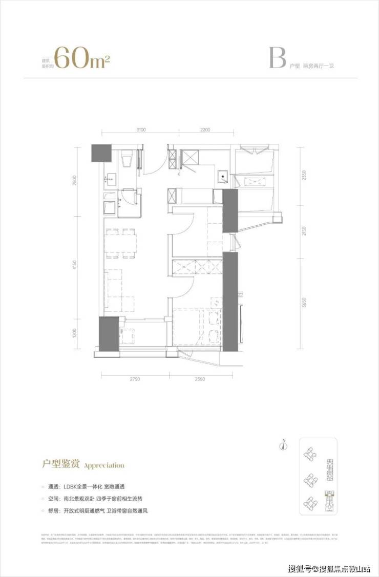 60㎡两房两厅(约1036套)是主力款,客厅餐厅一体带阳台,两间卧室都配飘窗,通风采光好。