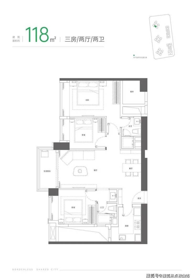 110㎡三房两卫(320套)是入门款,三个房间和客厅同一朝向,客厅带大阳台,主卧配飘窗和独立卫生间,餐客一体化设计,动静分区。
