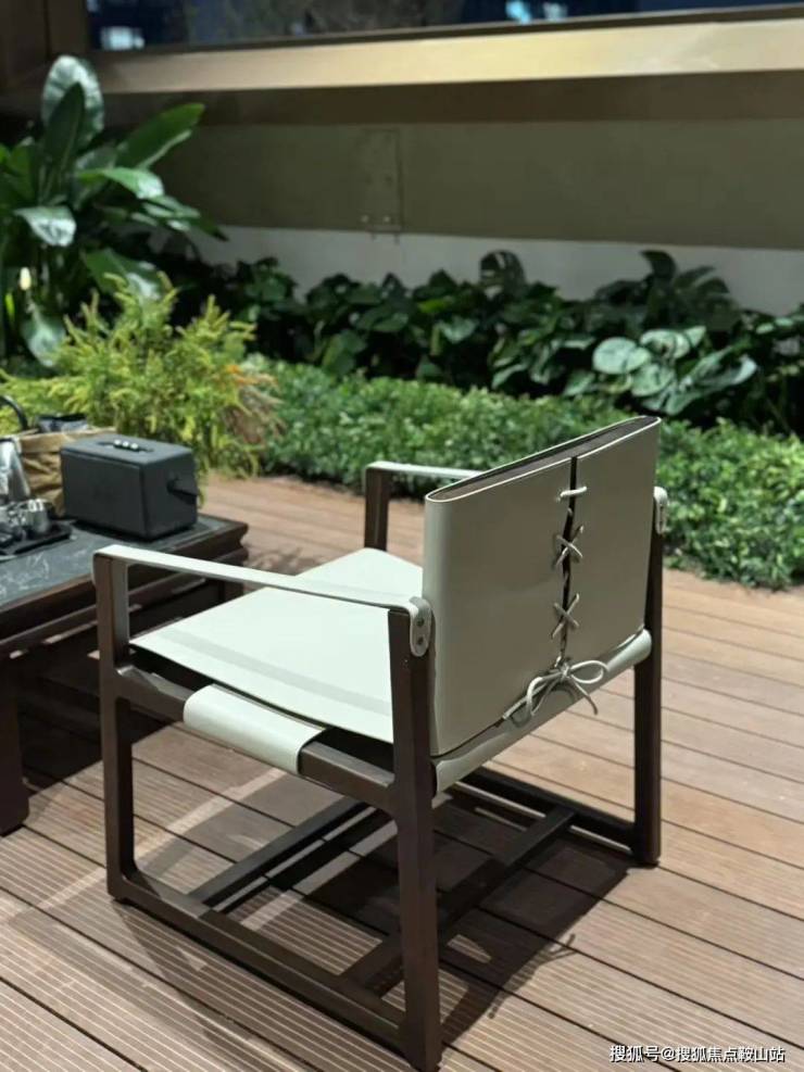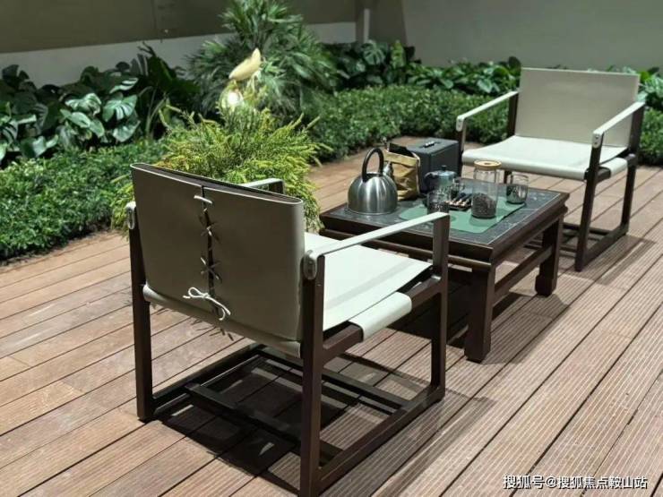 软装结合场景,搭配大理石庭院阳伞、藤编柚木座椅/吧椅、枪黑色茶几等休闲配置,匠心定制、用料考究,将现代工艺与奢华典雅的园林风格碰撞融合。
