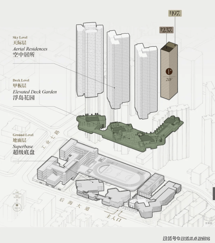 这次「后海招商玺」住宅设计采用“浮岛甲板”设计策略,四栋住宅落于甲板之上,独享甲板庭院花园。进而形成超级社区底盘 + 浮岛绿化甲板的垂直共生人居标杆。