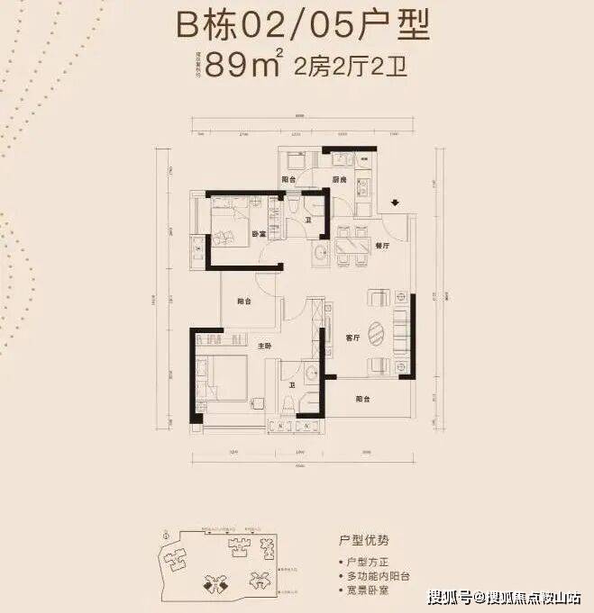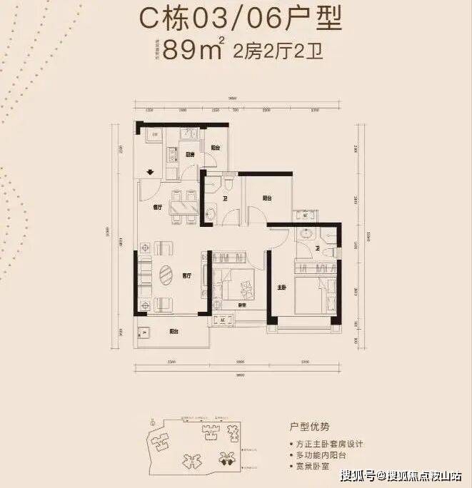 可算是01户型的加强版,通透设计通风采光优秀,客厅朝向西北,横厅布局有利于室内空间充分利用,餐客厅开间7.7米宽敞明亮,1.7米宽大阳台舒适度高视野景观优秀。主卧开间4.8米舒适度良好,但开窗方向景观资源较弱。双套间设计,书房与南向阳台可为两个独立空间也可合并做大房