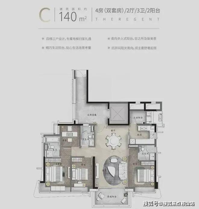 产品亮点:私家电梯入户、部分楼层三面采光、约3.4米层高、U型阳台360°观景、约6.8米挑空餐客厅、中西双厨、三套房设计、部分房间带阳台设计