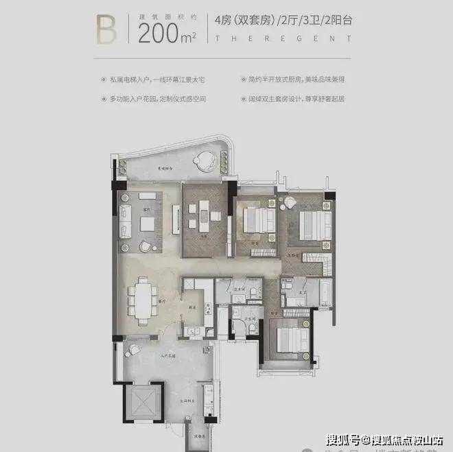 产品亮点:私家电梯入户、约3.4米层高、动静分区南北对流、约6.8米挑空餐客厅、中西双厨、三套房设计、部分房间带阳台设计