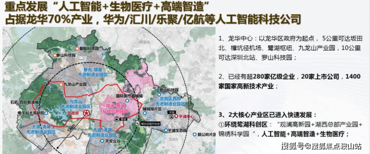 观澜占据龙华70%产业,鹭湖中心城与九龙山数字城双核驱动,聚焦人工智能、生物医疗、高端智造等高新技术产业;