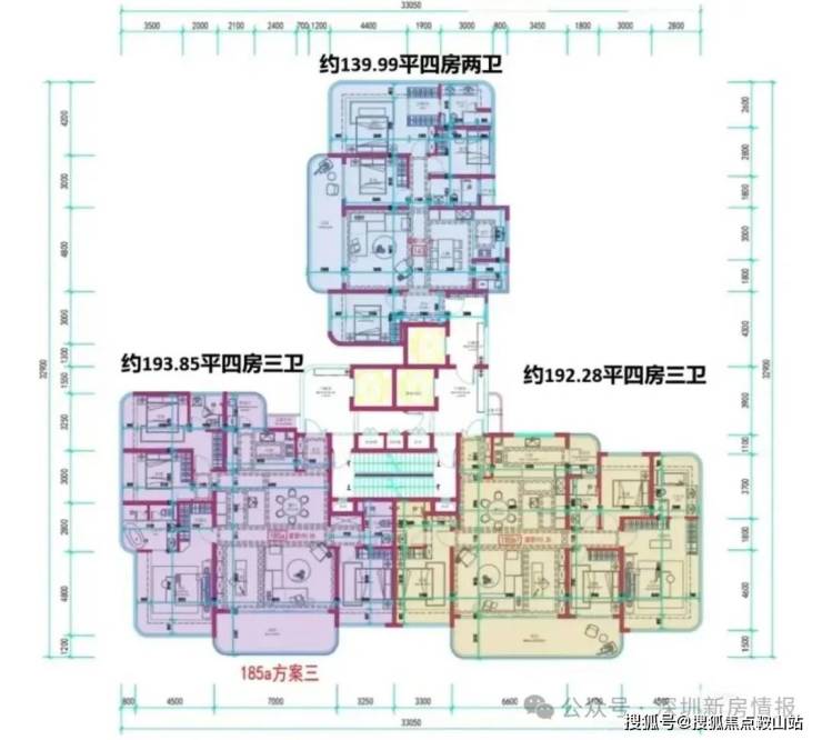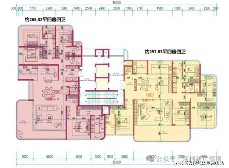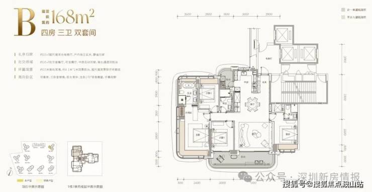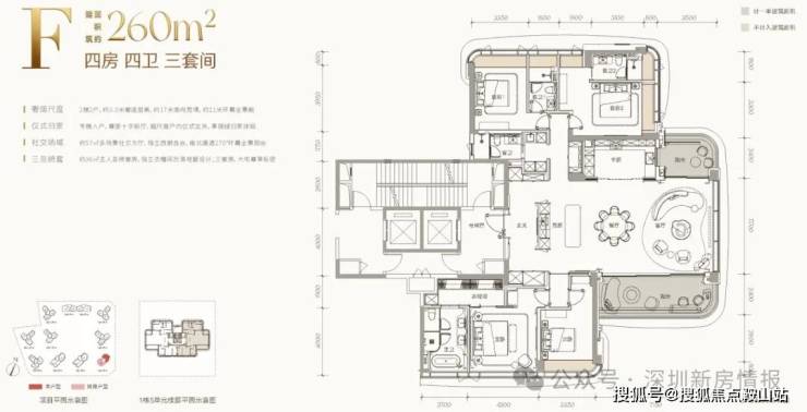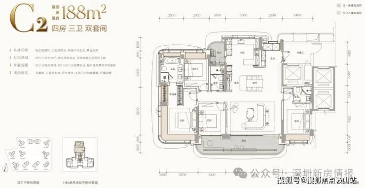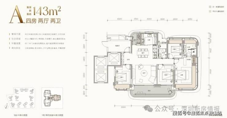 项目总占地面积约4.25万平方米,总建筑面积约21.63万平方米,容积率仅3.41,建筑限高80米,规划建设11栋20至24层小高层住宅,围合式布局,共计约610套房源,车位比高达1:2.08,充分满足高净值家庭的多车需求。产品方面,项目全系主打建面约143-332平方米的四至五房大平层,首推约182套房源,主力户型涵盖168㎡、188㎡、260㎡四房及约500㎡顶复产品。作为深圳建筑新规后的标杆产品,得房率接近100%,全系户型户户朝南,南向面宽达14-20米,配备7.8-9.7米宽景阳台和270°转角飘窗。价格方面,吹风价约12-15万元/㎡,168㎡户型总价约2200万元起,188㎡约2500万元起,260㎡约4000万元起,看房需验资600万元。预计2027年底精装交付。