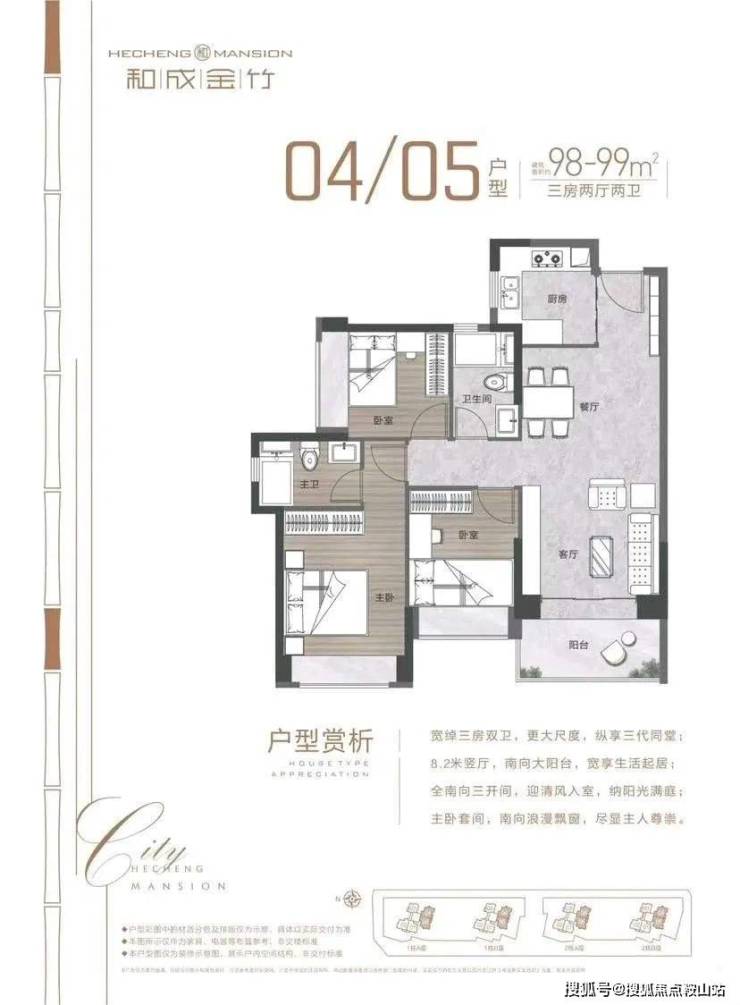 户型面积布局04/0598-99平三房两厅两卫设计的是经典竖厅格局,客厅3.6米开间,LDKB一体化设计,三开间朝南,3个卧室分别做到了3.2米/2.7米/2.7米的宽度,U型厨房,卫生间干湿分离,得房率78.3%(不含赠送),阳台东南朝向。