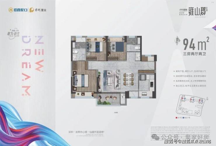 94㎡的3房2厅2卫,240-260万,设计的是横厅格局,进门独立玄关,客餐厅一体化,U型厨房,公卫三段式分离,得房率:70.9%(不含赠送),阳台朝西南或东南向。