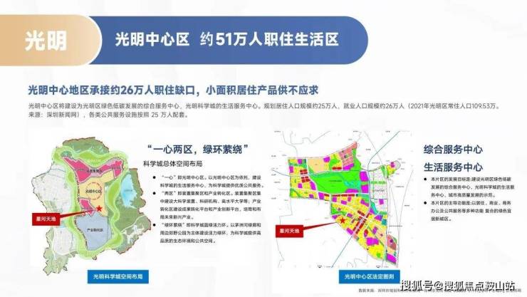 2020年6月9日深圳市规划和自然资源局发布《光明科学城规划刚要》中,规划“一心两区,绿环萦绕”的科学城总体空间布局,以光明中心区为依托,建设科学城的生活服务中心。(资料来源:深圳市政府在线)