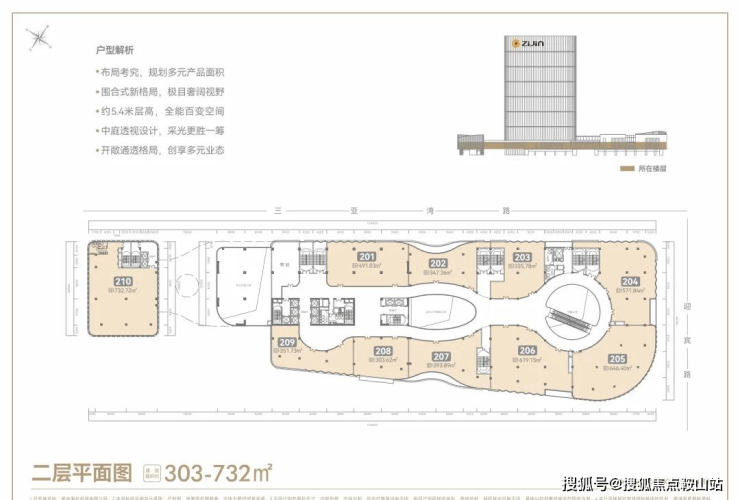 凤凰海岸单元——三亚中央商务区核芯片区,定位为旅游港自贸服务与邮轮、游艇、文化艺术综合消费区。紫金国际中心落位于此,匠造建面约6万㎡国际总部基地,实现区域城市服务、旅游文化、总部经济等产业资源全覆盖。