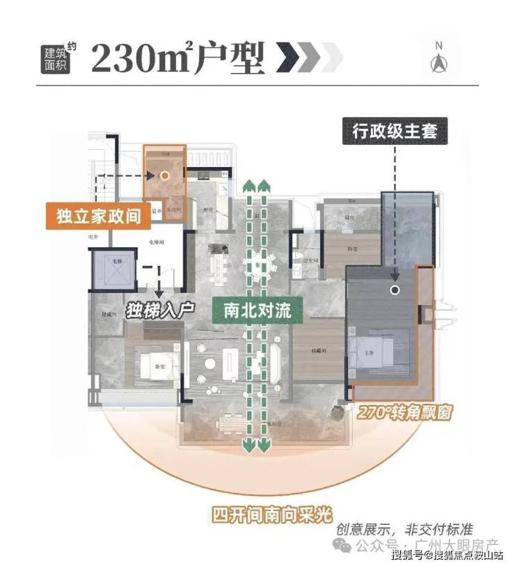 230平户型拥有私家电梯厅、双主套、独立佣人房、南北对流、LDKB大方厅、主卧L型270°飘窗等,大大提升了整体的空间体验。