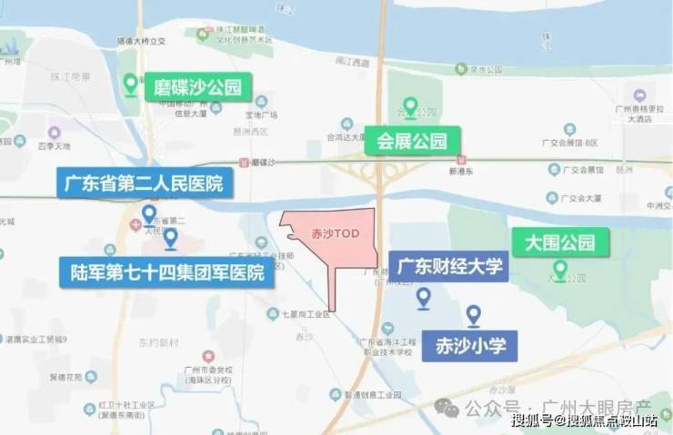 越秀琶洲南TOD项目位广东省广州市海珠区金运路1号,海珠赤沙TOD地块东侧紧挨华南快速干线,北侧隔着黄埔涌,对岸就是高楼林立的电商总部琶洲西区。
