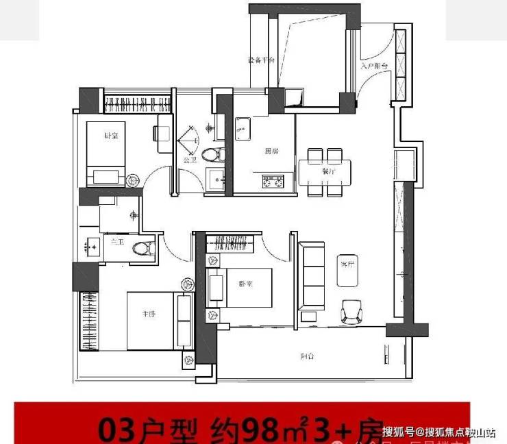 98m²(3+1)户型,带入户,竖厅格局,厅出阳台带新规大阳台设计,朝向整体以南为主,主卧以L型落地大飘窗,大大提高采光率,设备大阳台也是赠送面积,可多功能利用率更好,几乎无对视,刚需首先.